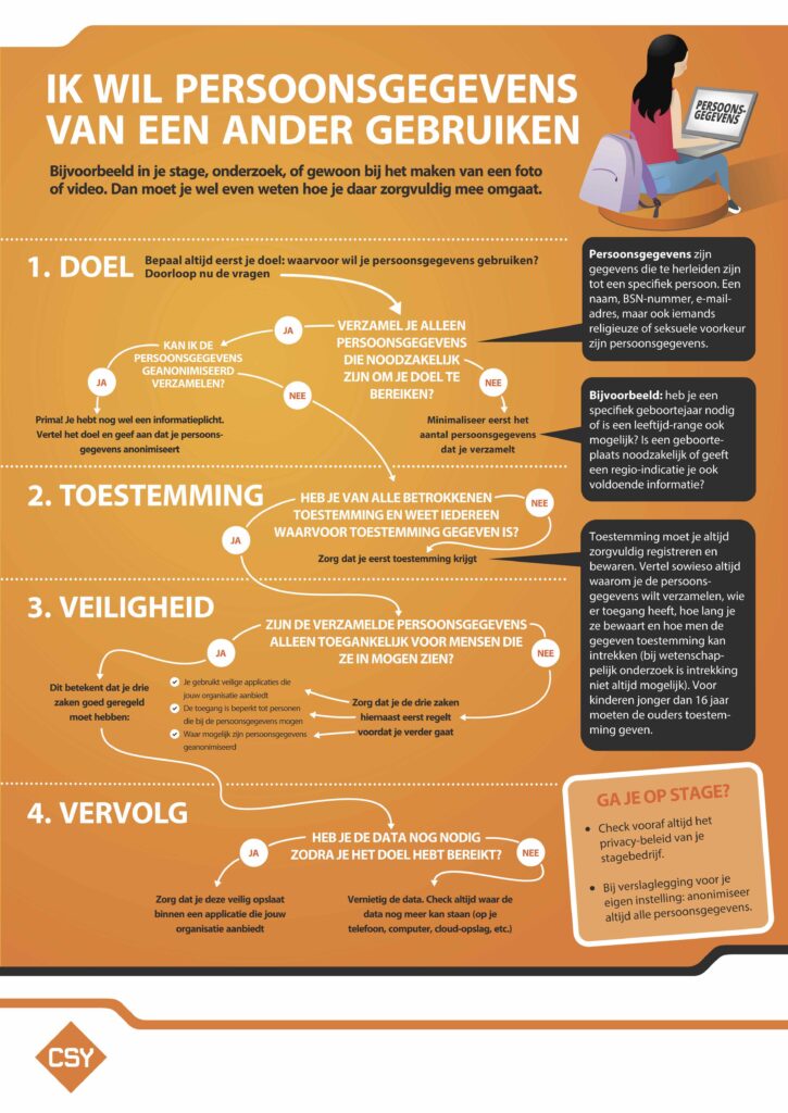 Wanneer mag ik persoonsgegevens van een ander gebruiken? Tijdens studie en stage zijn er momenten waarop je met persoonsgegevens van anderen werkt. Deze privacy poster geeft concrete handvatten voor studenten om te bepalen of persoonsgegevens gebruikt mogen worden.
